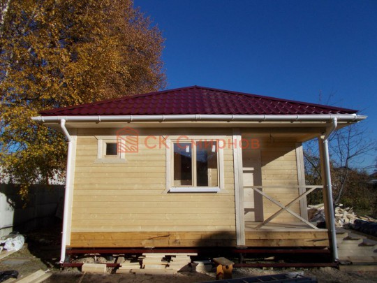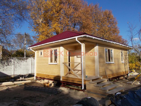 Такая одноэтажная баня 6х8 может быть построена из бруса. Ориентировочный срок строительства 10 дней.