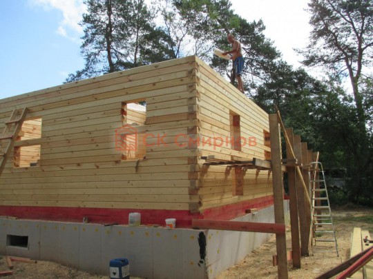 Из профилированного клееного бруса 9х14см, 14х14 см или 14х19 см. Сборка сруба в теплый угол на нагеля или гвозди 200 мм со сверлением отверстия в верхнем брусе (в зависимости от вида бруса).