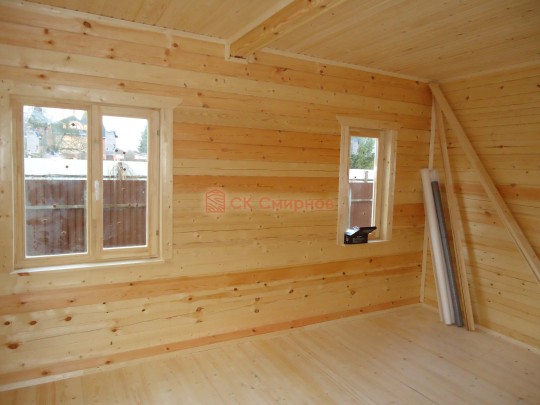 Из профилированного сухого бруса 9х14см, 14х14 см или 14х19 см. Сборка сруба в теплый угол на нагеля или гвозди 200 мм со сверлением отверстия в верхнем брусе (в зависимости от вида бруса).