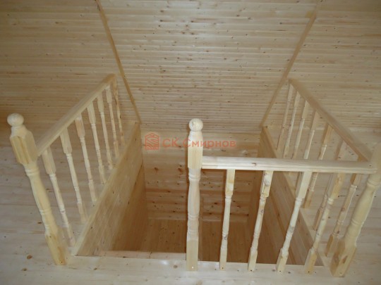 На террасе при условии что она есть делаем перила из строганной доски со всех сторон, столбы террасные также строганные, а не обрезки профилированного бруса с шипом и пазом. Домкратики на столбах для дальнейшей регулировки. Балясины будут сделаны аккуратно. Обратите внимание что в дешёвых случаях это может быть и будет просто вагонка прибирая к неотесанной доске снаружи и столбы будут не квадратные а просто профилированный брус как на видео.