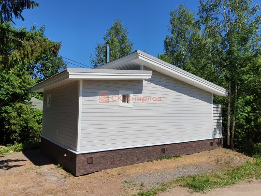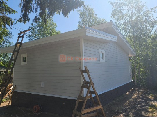 В июне 2020 мы строили красивую современную каркасную баню под ключ для смелых, готовых к нестандартным решениям клиентов. Был выбран одноэтажный проект бани с панорамными окнами, стеклянной дверью-стеклопакетом и дизайном в стиле Хай-Тек.