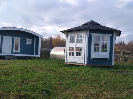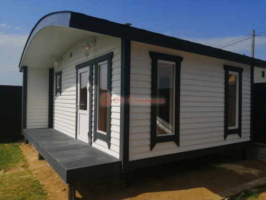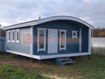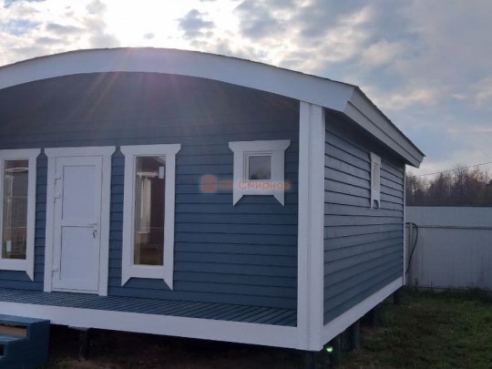 В нашем каталоге каркасных бань есть несколько очень красивых проектовавторских бань. В июне 2020 мы завершили строительство одной из них. Это одноэтажная баня каркасной сборки с округлой крышей, террасой, высокими панорамными окнами и роскошной парной, обшитой ароматнейшим кедром. Размер 5 на 5 метров. Внутри разместились комната отдыха, парная, помывочная с душевой системой и санузел, который по совместительству является бойлерной.