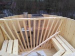 При строительстве террасы купель встраивается в неё — под неё необходим фундамент (хватает винтовых свай).